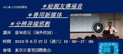 簡報:JCC第六次培訓圓滿結束了! 2015年6月27日(星期六)梅雨天,依然有14間教會的50位弟兄姐妹匯聚一堂!學以致用的信息、深受啟發的分享、姐妹們愛心提供的豐盛午餐、、、、、無不使出席者身、心、靈大得飽足!培訓後,弟兄姐妹們抓住飯桌時間,繼續向基甸老師請教。第二天,基甸老師就揮別日本,回美國了。求主紀念基甸老師的辛勞,保守海外校園成為全球華人的祝福!