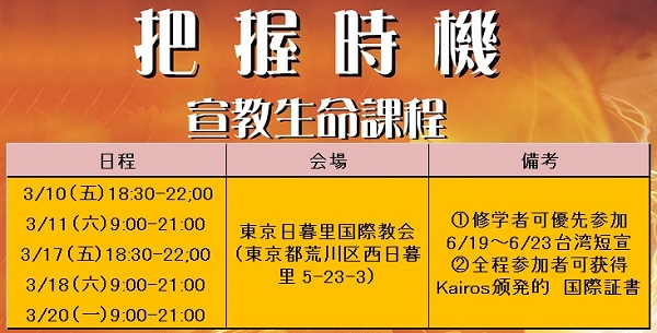 世界矚目的Kairos宣教課程語華語培訓,首次登陸日本。在3月10日~3月19日,舉辦了爲其5天的40小時的培訓。來自9間不同教會的32名肢體報名參加,最後有20人圓滿結業。每一位參與者都感慨萬分,最大的共鳴是眼界大開了;強烈地認識到宣教,是我們基督徒生命中不可分割的一部分,是每一位基督徒和教會的使命。該課程內容新穎豐富,視頻令人耳目一新;小組分享,爲鮮聞福音族群的聚焦禱告,都是那樣的振奮人心!