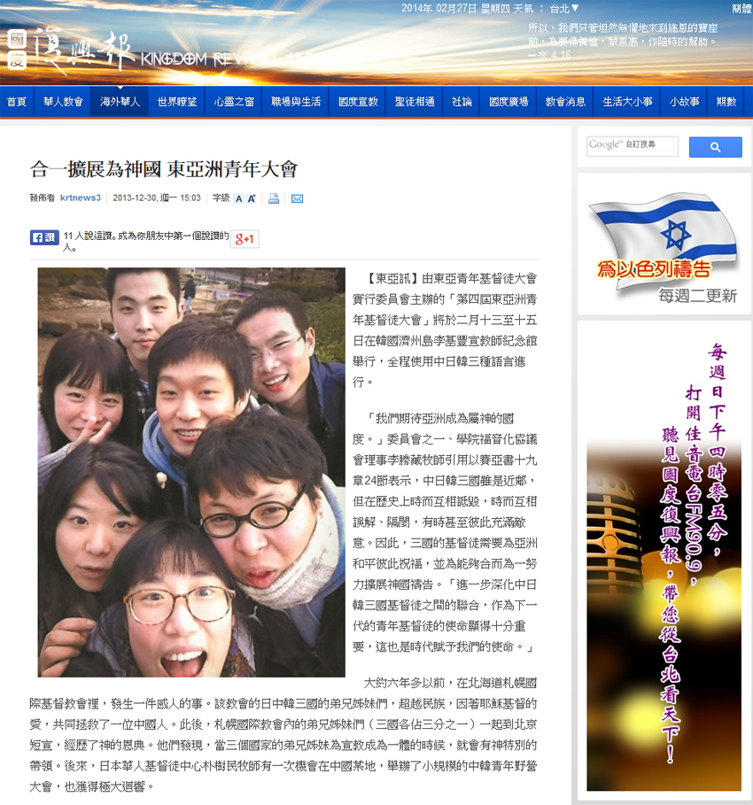 台灣基督教網絡媒體《國度複興報》網站以《合一擴展為神國 東亞洲青年大會》為題名,報導了本次東亞洲青年基督徒大會。