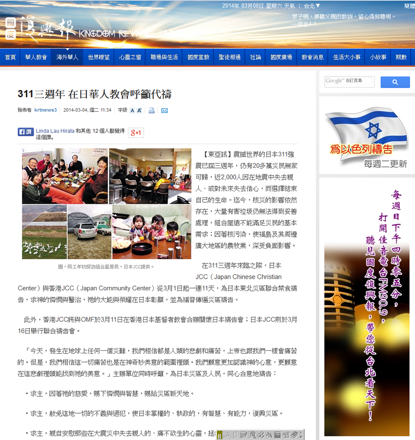 Taiwan Christian Media (Nation revival Newspaper) reported Fasting Prayer for 3.11 by Japan JCC &Hongkong JCC.