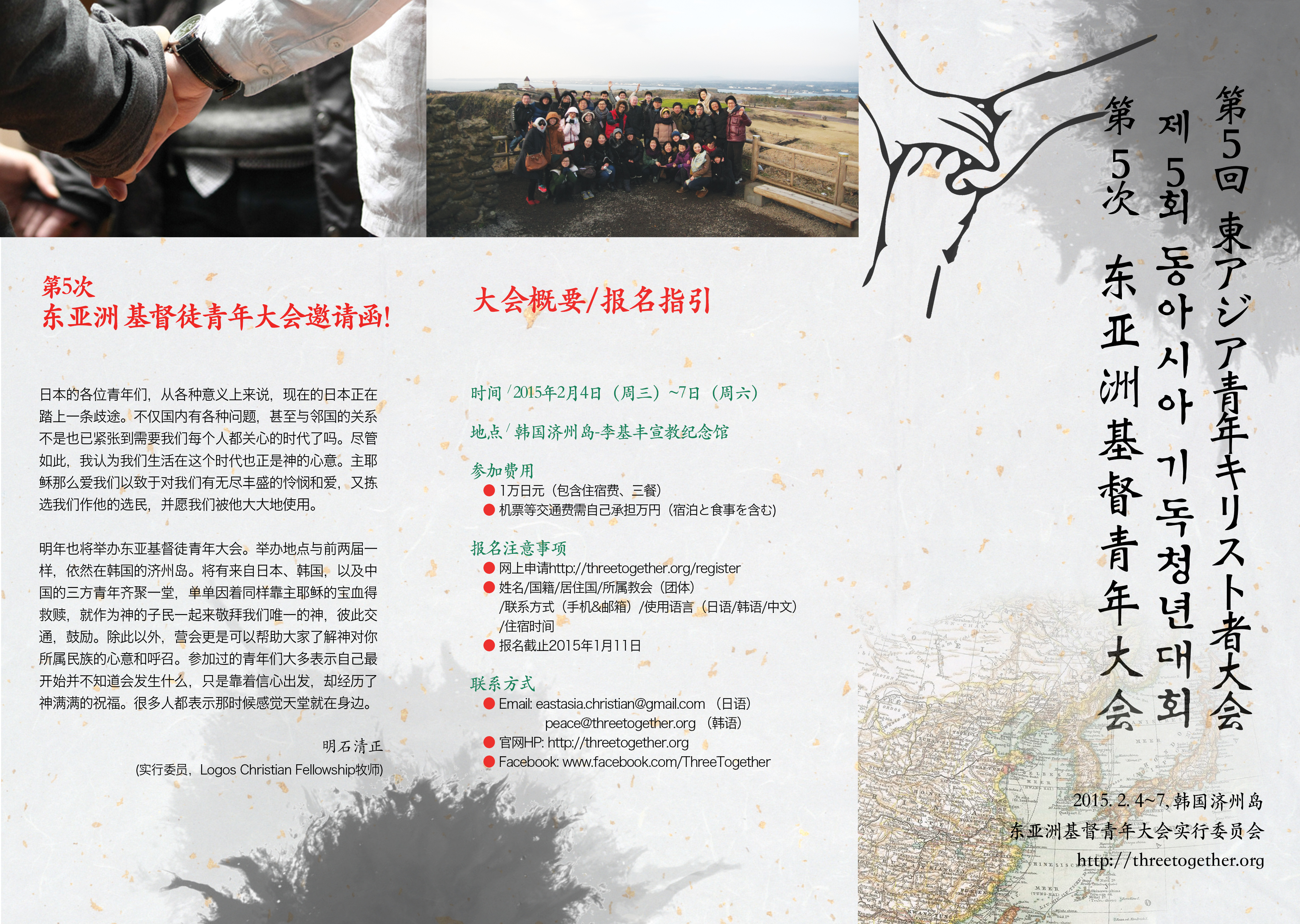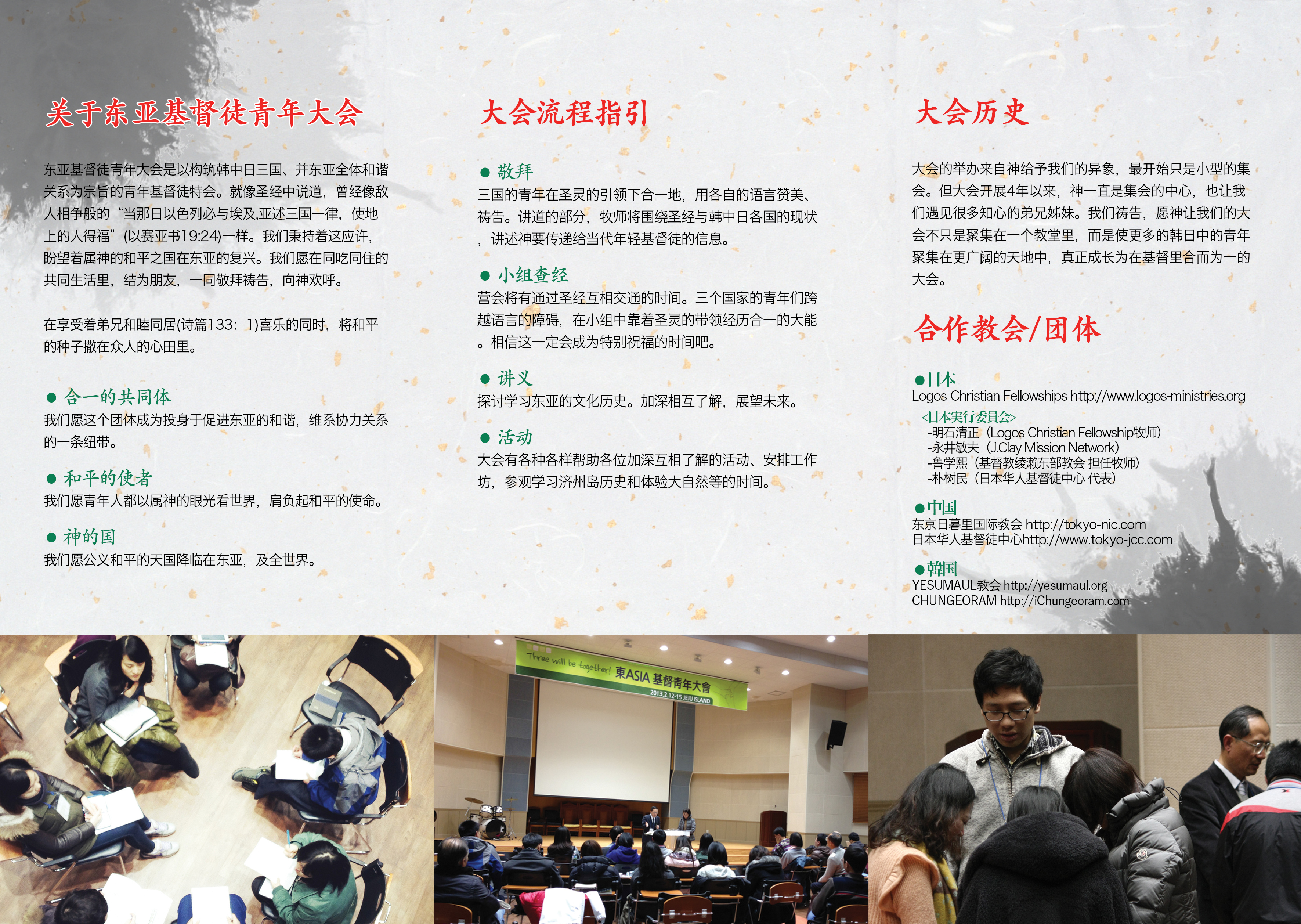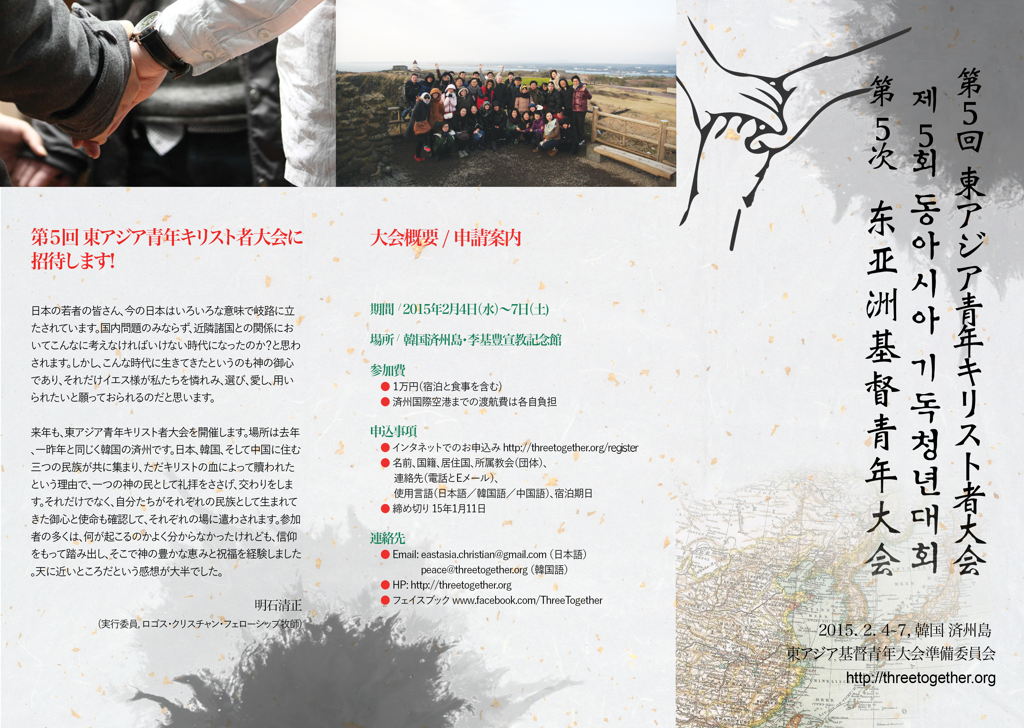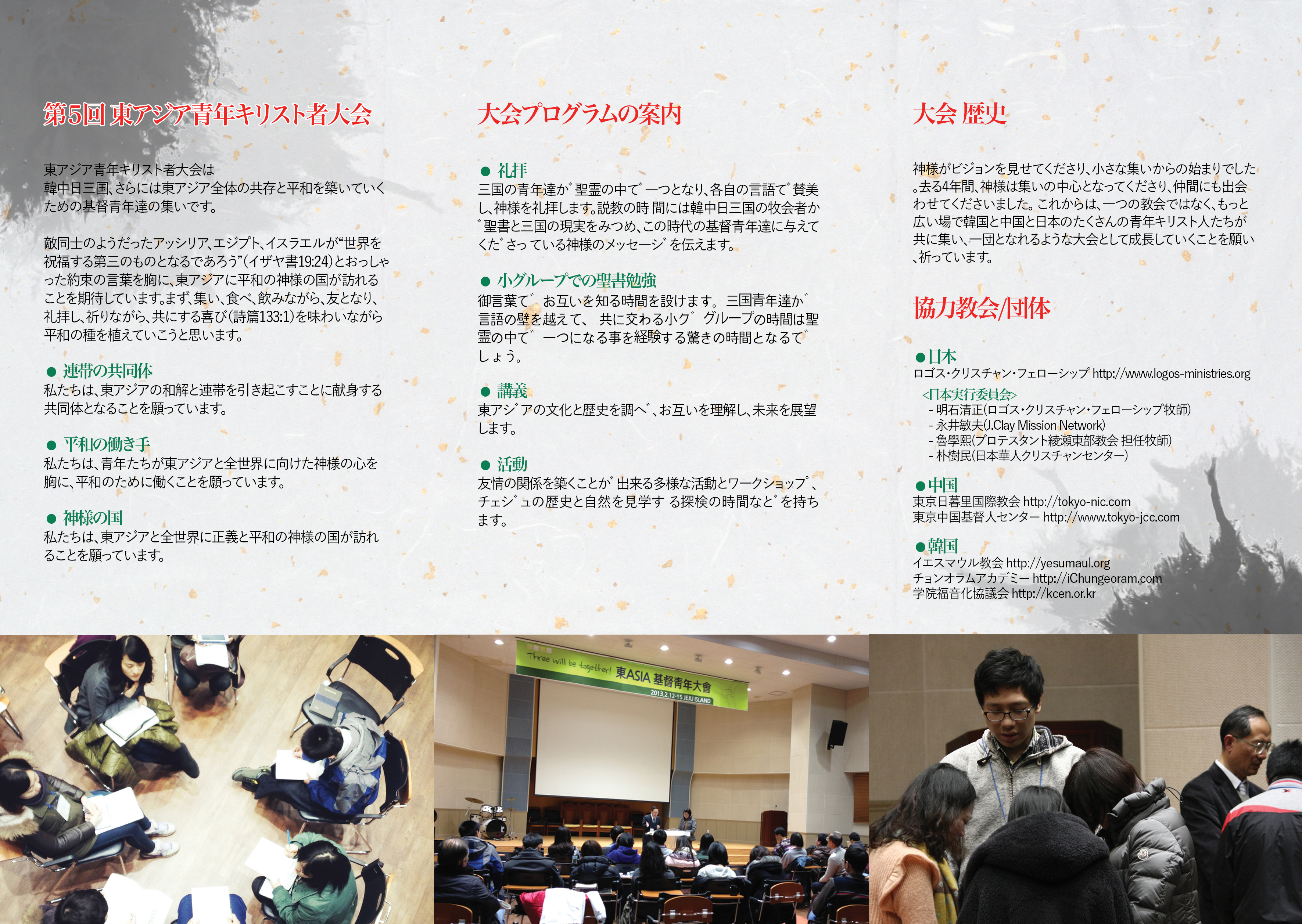 益々注目されている中韓日三国中心に集まる東アジアキリスト青年大会は第五回目大会が新年早々の2月頭に韓国済州島で開催。今日は、日本と中国、又、日本と韓国が厳しい関係の中で、むしろクリスチャンの若者たちが集まり友情を結んでいるこの大会は全て神様からのお賜リものです。2010年から始まり、参加者が年々倍位の勢い増加して来るこの大会はより神様の国度を奉仕できるようにより大きの参加者を心待ちしております。開催時期は混雑期のため、早めの申し込みを呼びかけている